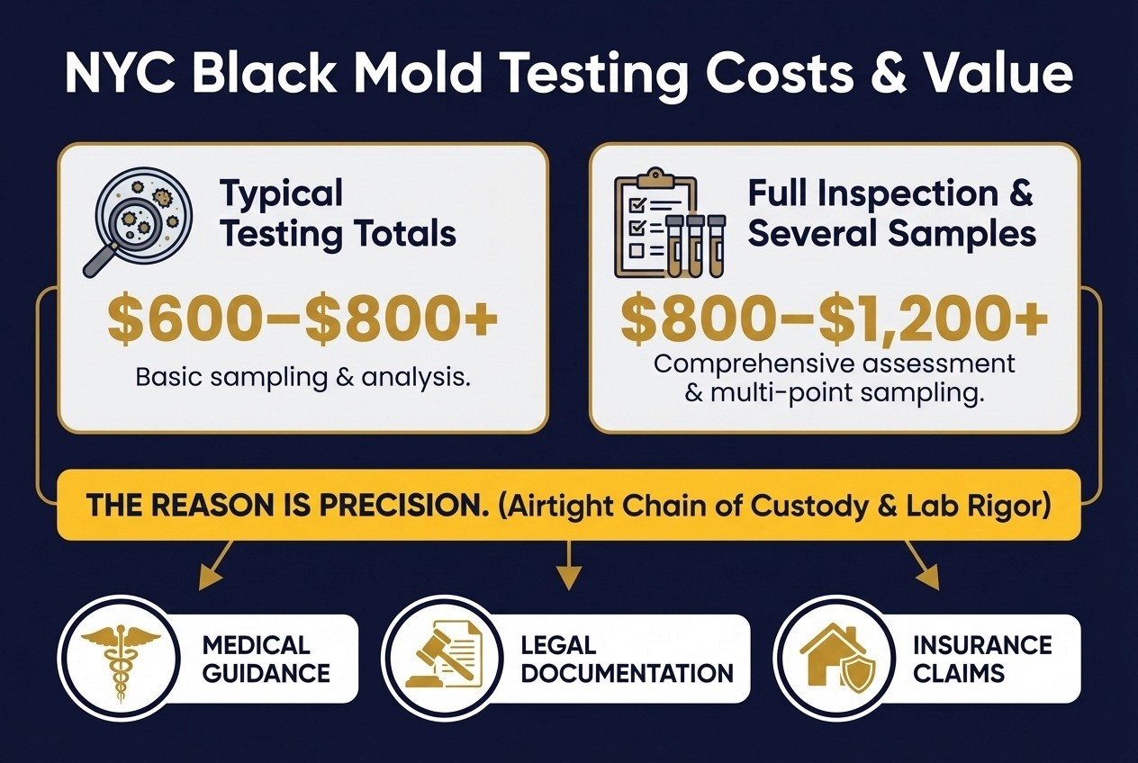 Typical NYC black mold testing totals run $600–$800+, and $800–$1,200+ when combined with a full inspection and several samples.